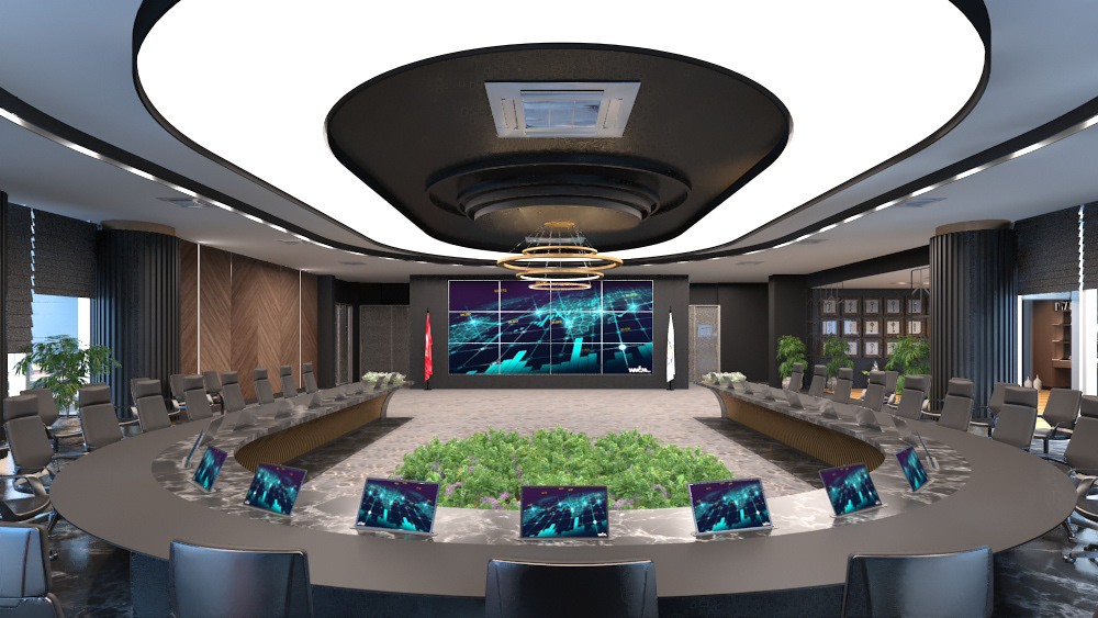 Gebze Belediyesi için tasarlanan lobi ve toplantı odası projesi, modern mimari çizgileri, yüksek teknoloji entegrasyonu ve konforlu kullanım alanlarıyla dikkat çekmektedir. Toplantı odasında yer alan dairesel masa formu, katılımcılar arasında eşit iletişim imkânı sunarken ortadaki yeşil bitki düzenlemesi mekâna doğal bir dokunuş katmaktadır. Yüksek çözünürlüklü LED ekran, toplantı ve sunumlarda görsel etkileşimi artırırken, şık aydınlatma elemanları ve tavandaki dinamik formlar mekânın prestijli kimliğini güçlendirmektedir. Lobi bölümü ise ferah, aydınlık ve misafirleri karşılamaya uygun davetkar bir atmosferle tasarlanmıştır.