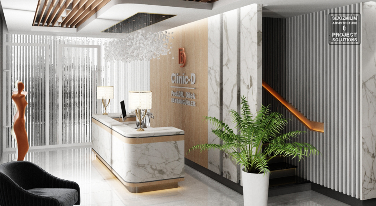 I Clinic-D Dermatology Ofis Tasarımı, medikal hizmetin profesyonel çizgilerini, iç mekân tasarımında estetik bir anlayışla buluşturan bir projedir. Mermer ve ahşap birlikteliği, modern aydınlatma unsurlarıyla desteklenerek kullanıcıya hem güven hem konfor sunan bir ortam yaratılmıştır.