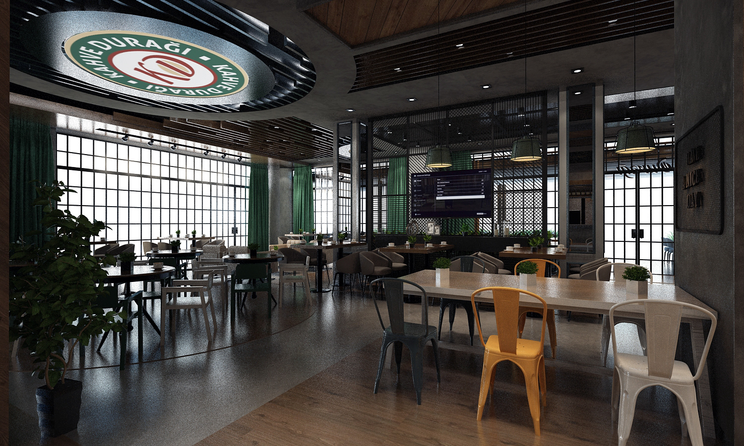 Kahve Durağı projesi, modern dış cephe tasarımı ve samimi iç mekân düzeni ile ziyaretçilere hem estetik hem de rahat bir ortam sunmayı hedeflemektedir. Dış cephede kullanılan koyu gri tonlar, geometrik desenlerle zenginleştirilmiş metal paneller ve geniş cam vitrinler, markanın güçlü ve çağdaş imajını desteklemektedir. İç mekânda ise tuğla duvar dokusu, sıcak ahşap zeminler, bitki yerleşimleri ve loş aydınlatmalar ile davetkâr bir atmosfer oluşturulmuştur. Mekân; bireysel ziyaretler, arkadaş buluşmaları ve kısa kahve molaları için ideal bir sosyal alan olarak tasarlanmıştır.