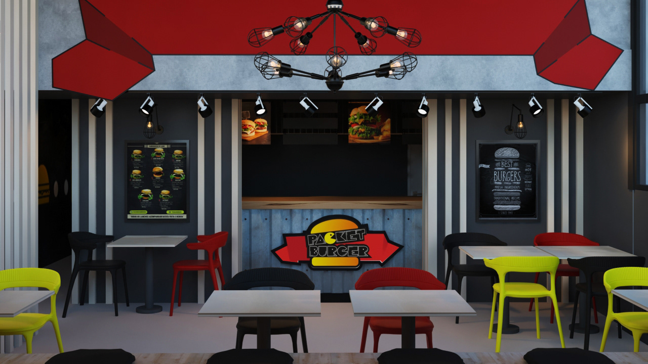 Packet Burger, modern fast-food kültürünü dinamik renkler, cesur grafikler ve eğlenceli bir atmosfer ile buluşturan özgün bir restoran konseptidir. Tasarımda, siyah-beyaz çizgili paneller ve canlı sarı-kırmızı mobilyalar, mekâna enerji katarak markanın genç, dinamik ve hızlı servis anlayışını yansıtır. Duvarlarda kullanılan Pac-Man temalı grafikler, müşterilere nostaljik ve eğlenceli bir deneyim sunar. Açık mutfak düzeni, müşteri ile üretim alanı arasında şeffaf bir bağ kurar.