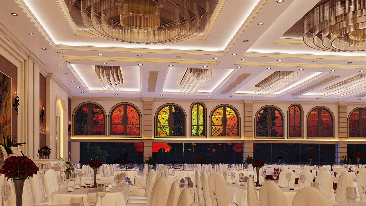 Klasik mimari dokunuşların modern bir yorumla buluşturulduğu Düğün Salonu Projesi, görkemli giriş cephesi, geniş iç hacmi ve detaylı süslemeleriyle göz kamaştırıyor. Yüksek tavan, zarif tavan aydınlatmaları ve kemerli pencereler mekana ihtişam katarken, oturma düzeni konfor ve estetiği bir arada sunuyor.